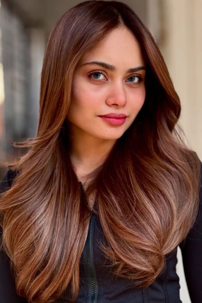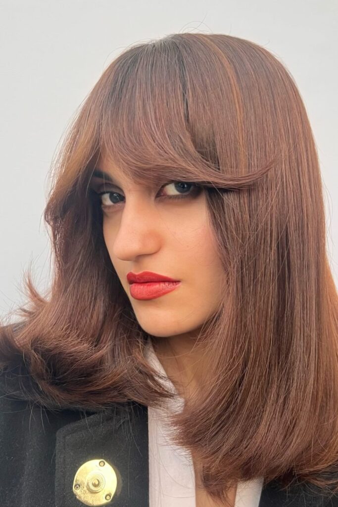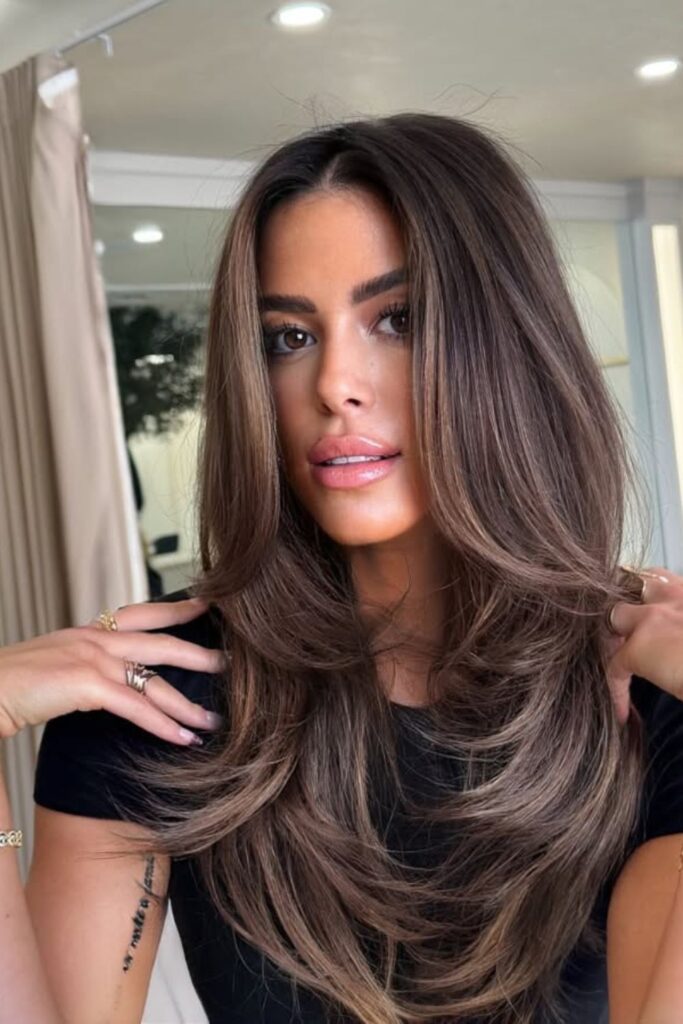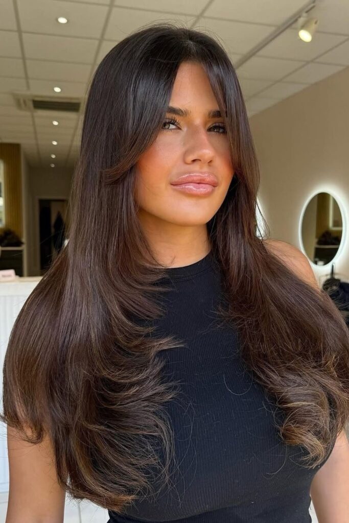 A rich chocolate brown shade with flowing layers creates a timeless and polished look.