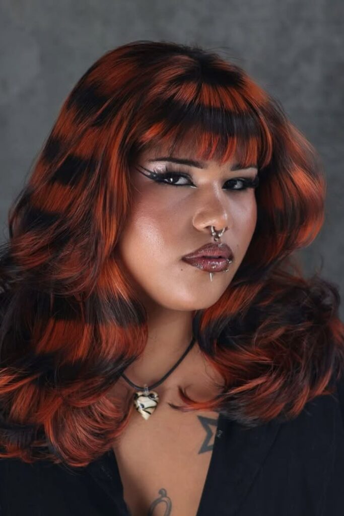 For a daring, standout look, fiery orange-red streaks are layered with bold black tones in a striking striped design.