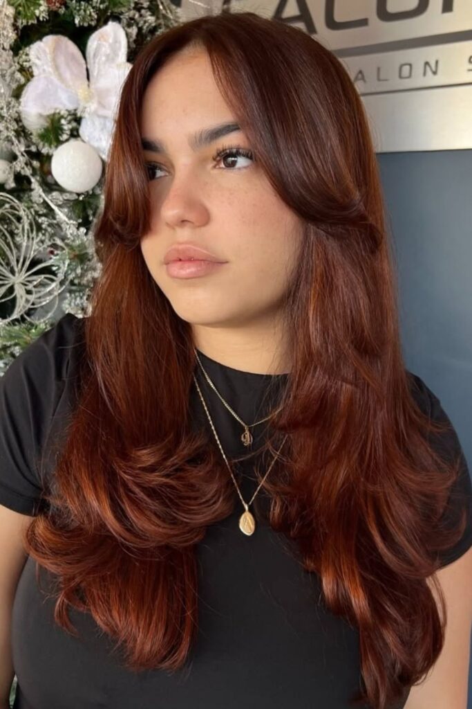 A spicy cinnamon base color paired with layered, feathered ends creates a lively and stylish look.