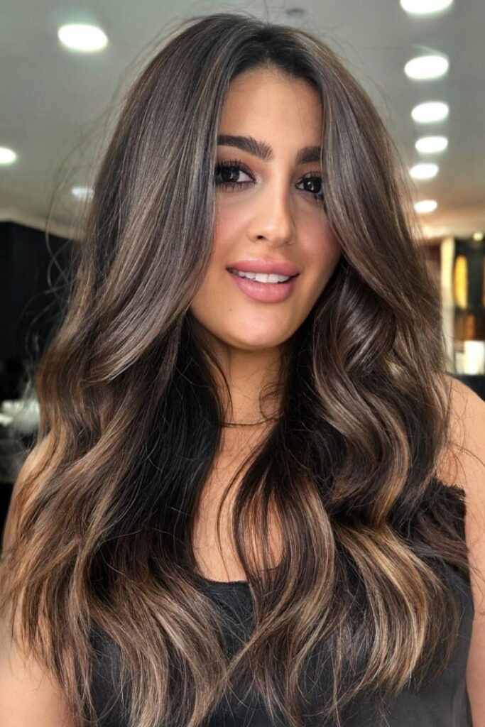 Add gentle warmth to your look with delicate caramel highlights on a dark brunette base.