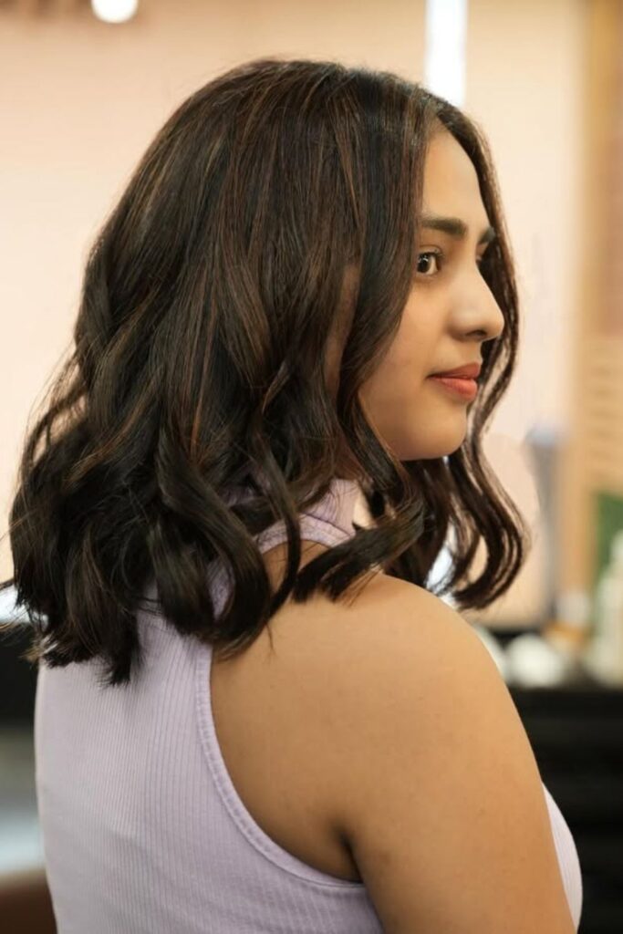 The shoulder-length waves add movement and showcase the brightness of the highlights, creating a carefree yet polished vibe.