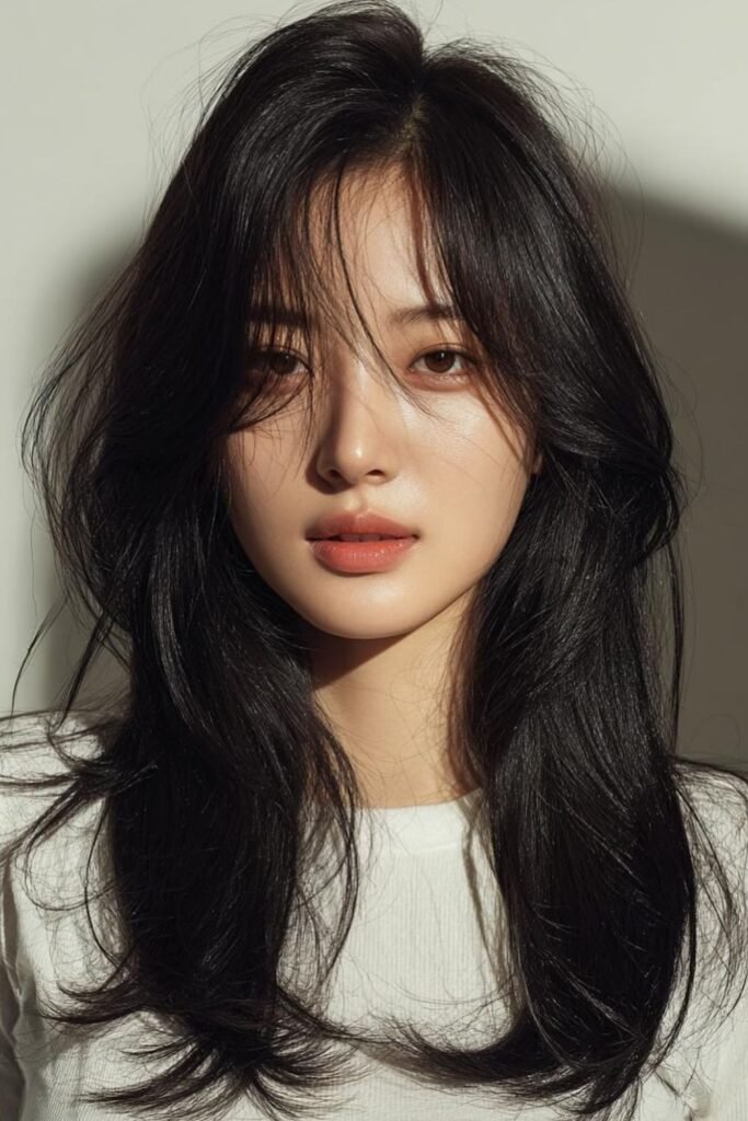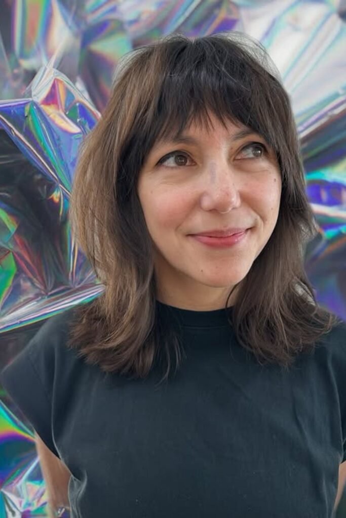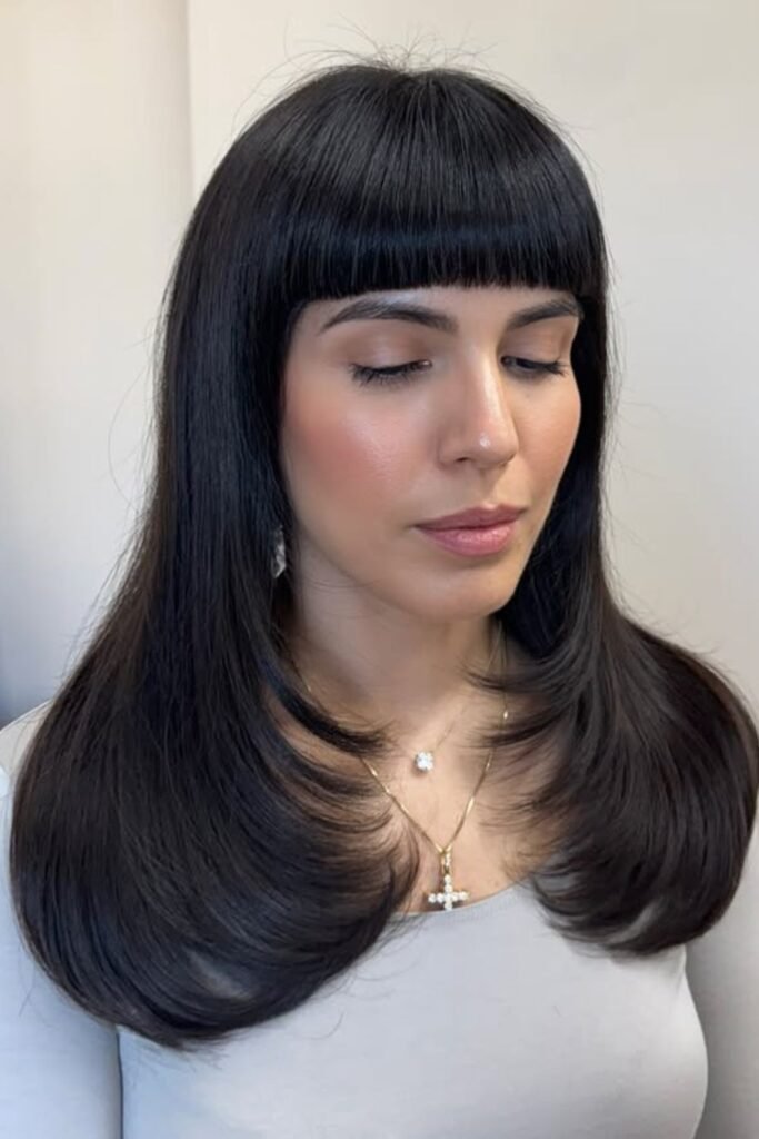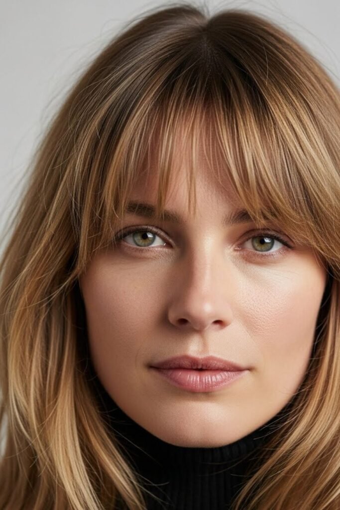 Heavy bangs can trap attention at the jaw. Floating fringe avoids that. These bangs sit lightly on the forehead and blend quickly into the sides instead of creating a hard frame.