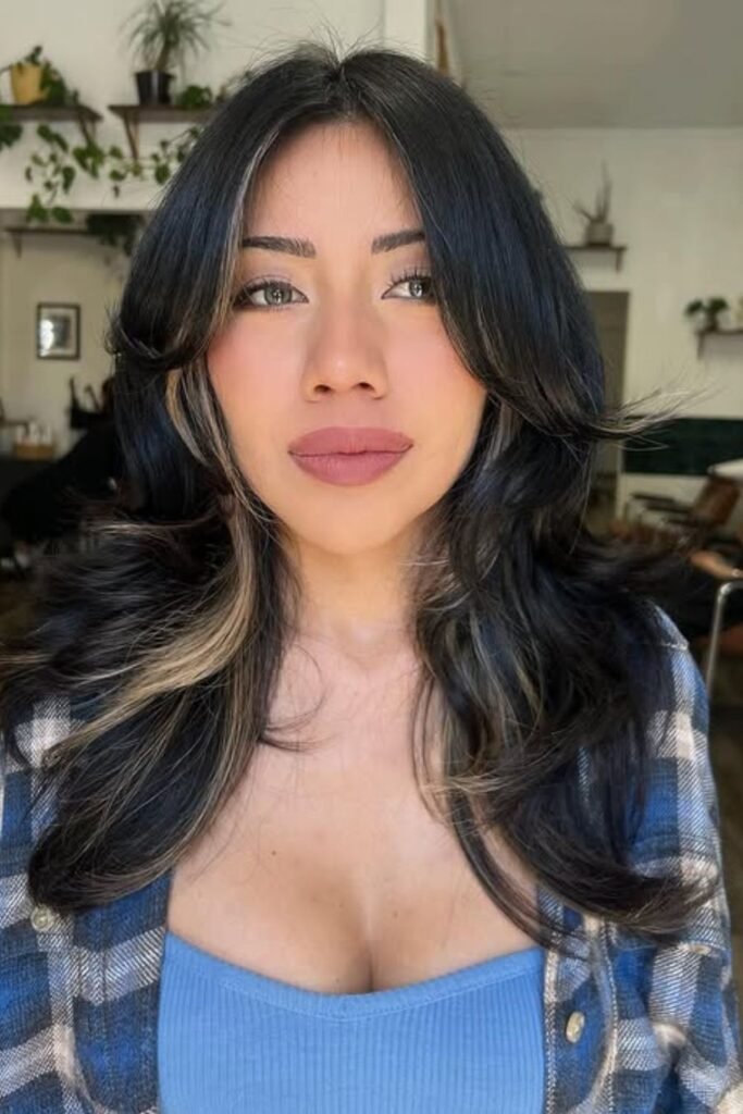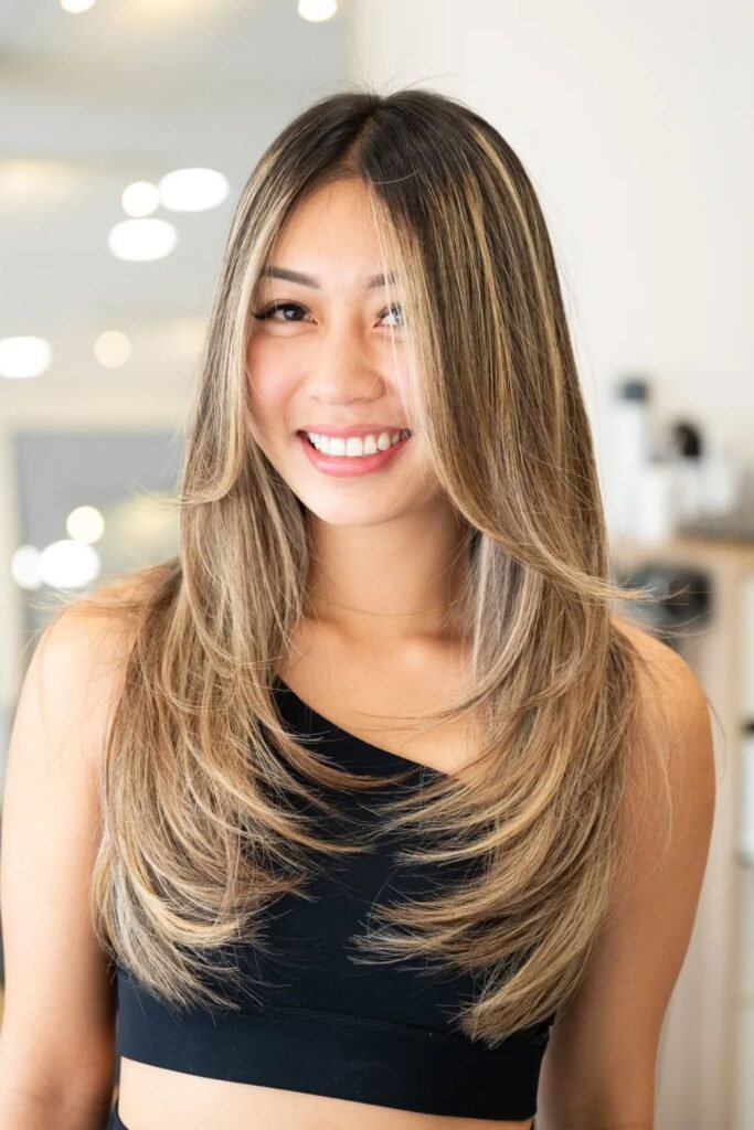 Long curtain pieces should just graze the cheekbones, then cascade into layered lengths. This technique softens any harsh angles.