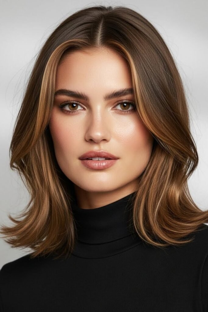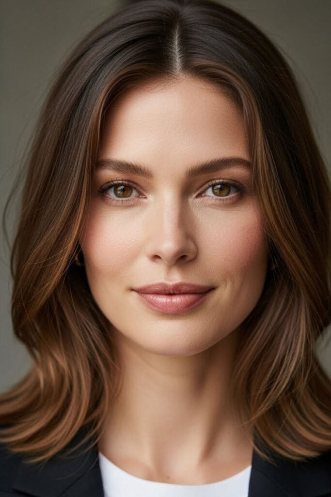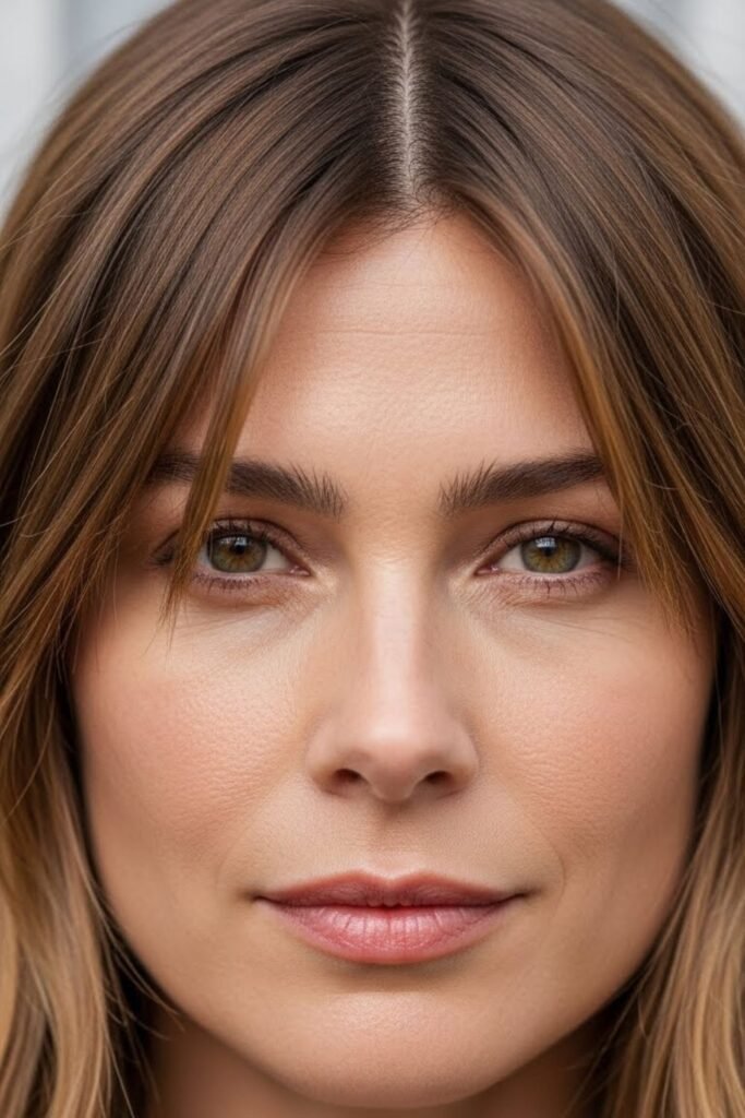 Eyes become the focus when the hair opens softly down the middle instead of framing the jaw straight on.