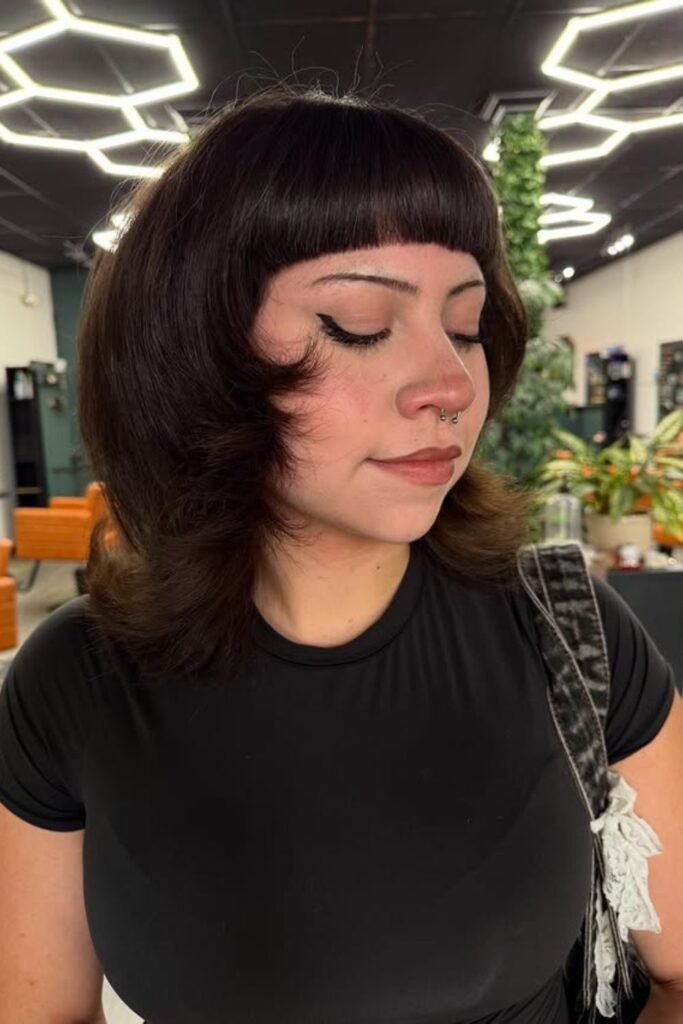 Drama works here because the shape stays rounded, not sharp. Short bangs pull attention upward.