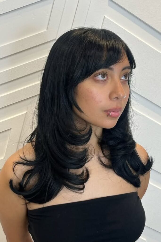 The layers should be integrated with the ends gently flipped. Request curtain bangs that are longer on the sides and be careful to prevent a too-short or blunt cut.