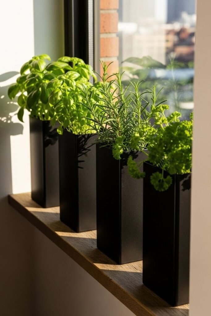 Thin windowsills forced creative thinking and careful plant choice. Slim rectangular planters fit lengthwise without blocking glass. Herbs receive direct light while staying stable.