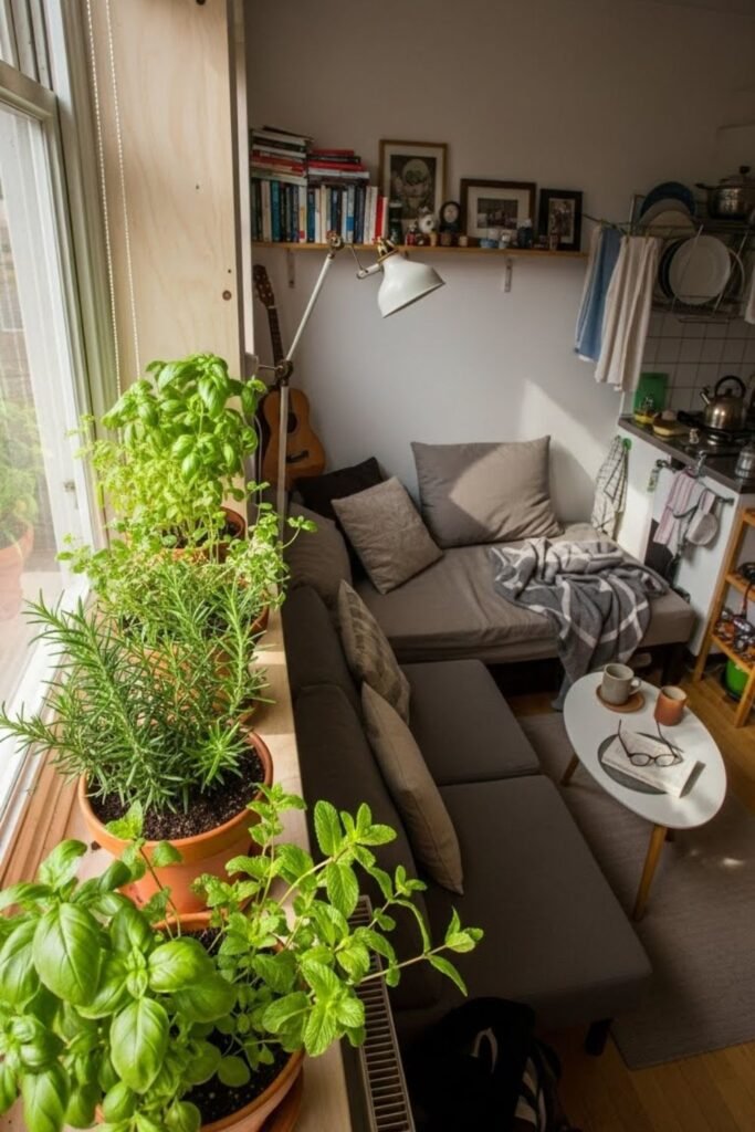 Living in a studio forced me to simplify every gardening choice. One narrow surface holds everything I grow. Fewer herbs mean better care and zero overwhelm.
