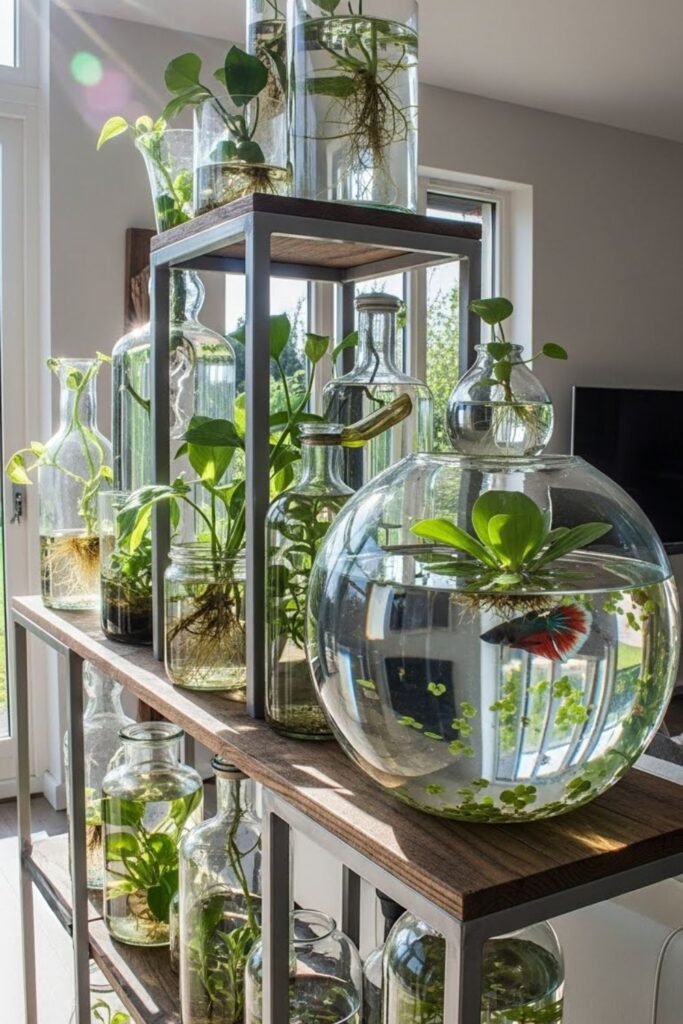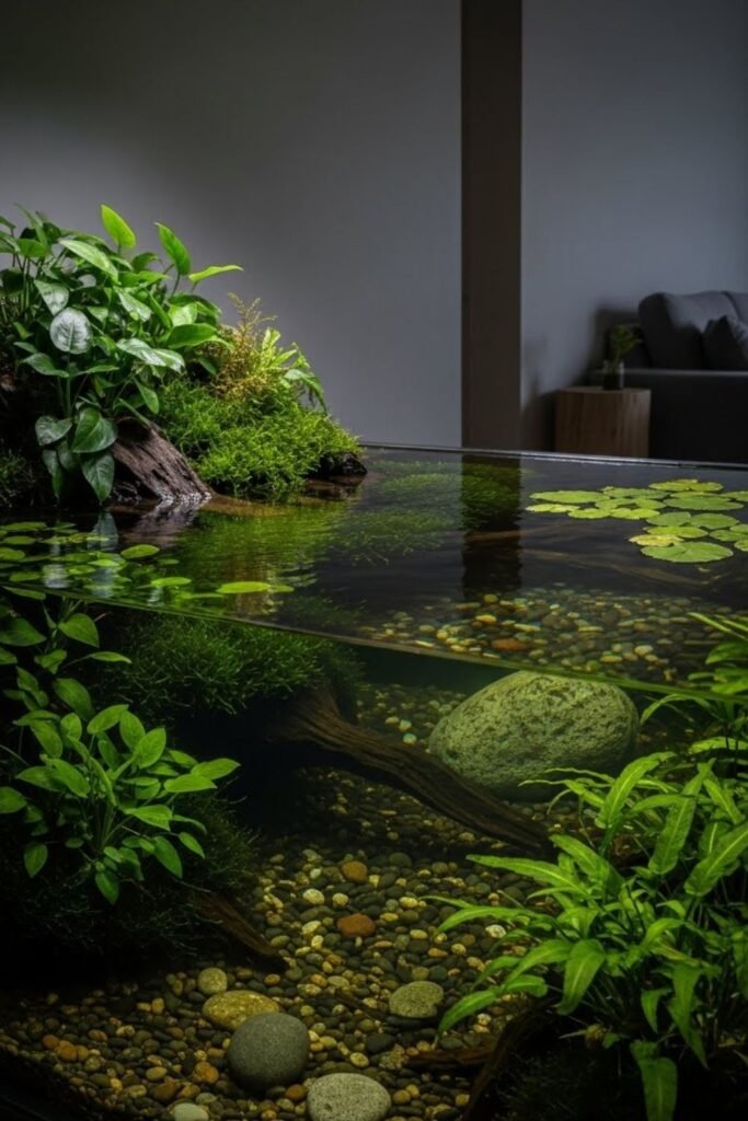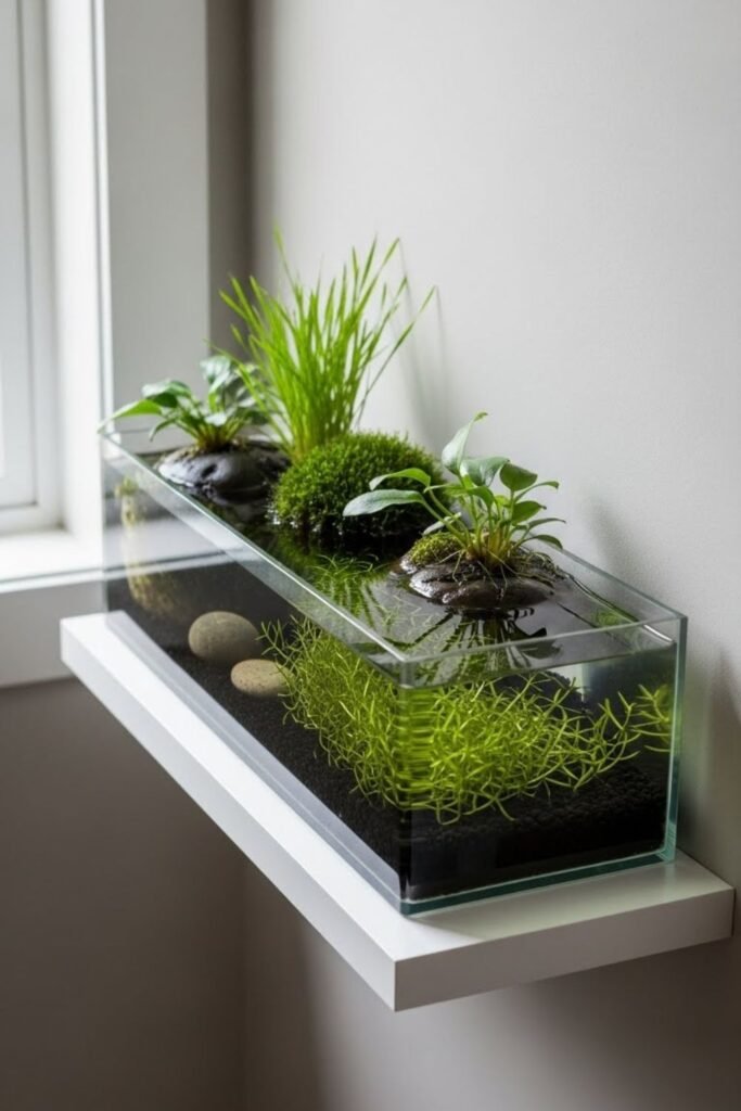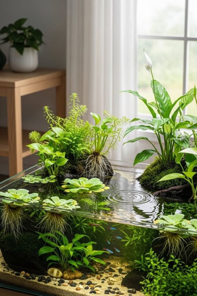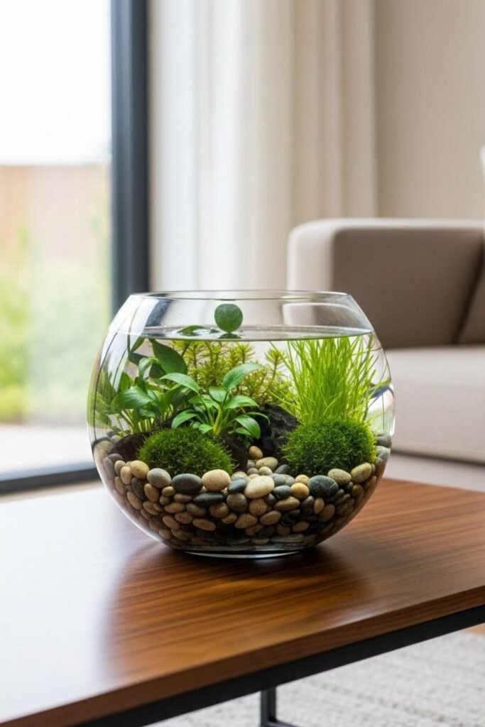 I refresh water regularly and remove dead leaves early. Light stays indirect to prevent algae. This idea suits people who want silence and simplicity.