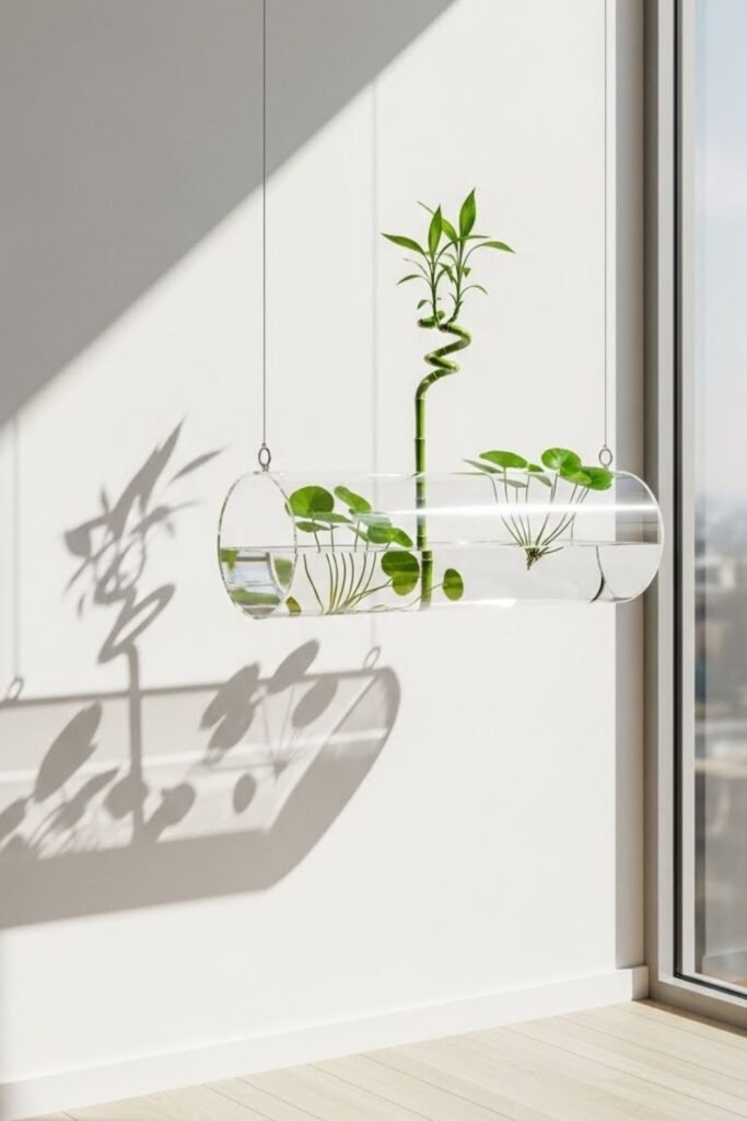 I use this idea when I want water at eye level instead of on surfaces. Hanging containers create interest without crowding furniture. I make sure weight stays light and mounting stays secure.