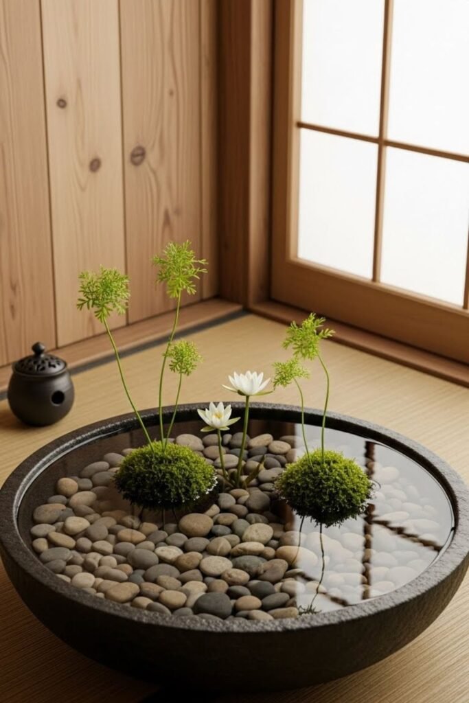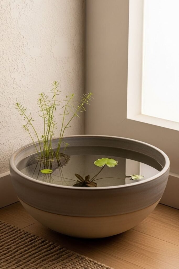 This setup works best near reading chairs or quiet corners where you sit often. When the container feels grounded, the water stays visually calm too.