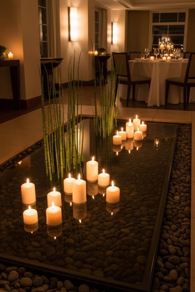 If you want a water garden that works as mood lighting, this idea fits dinners, quiet nights, or short moments of calm after a long day.
