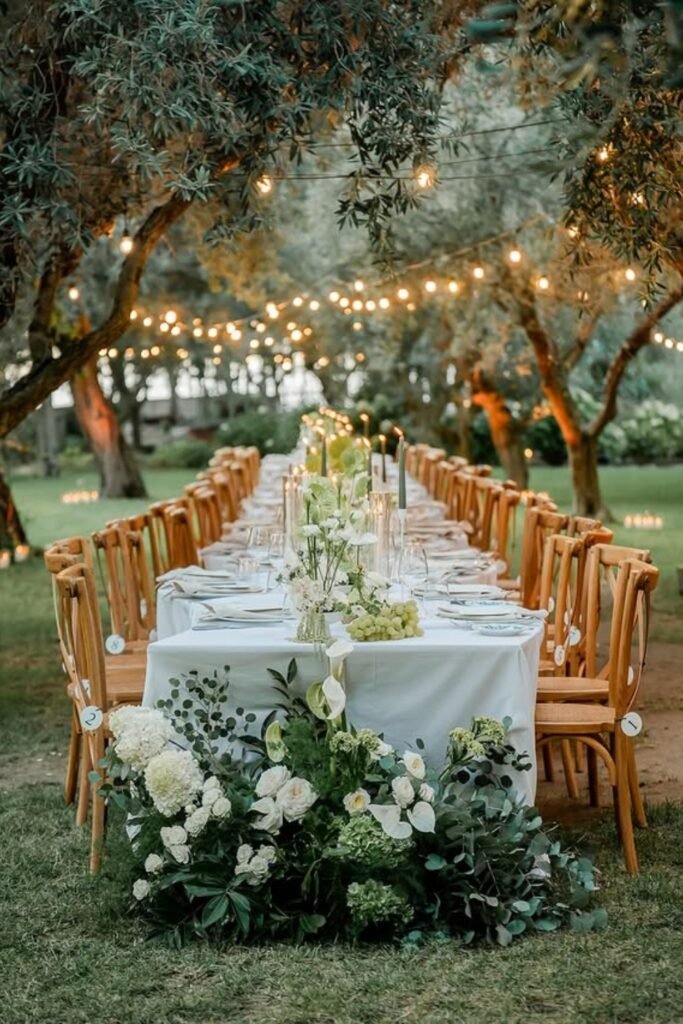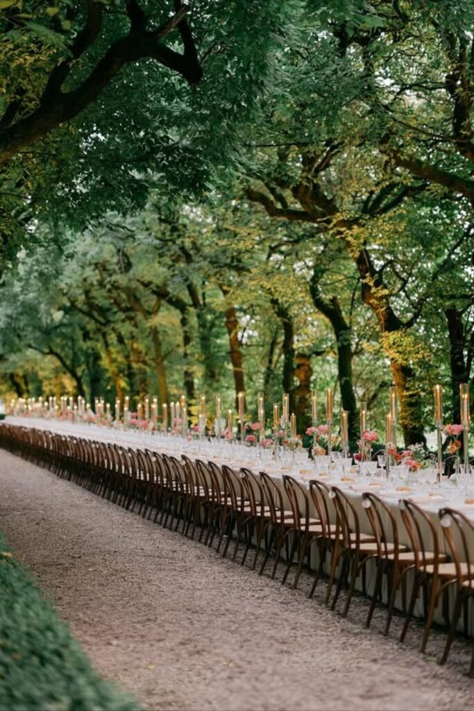 Long tables under trees work best when you embrace length fully, guiding guests through the space instead of breaking seating into clusters.