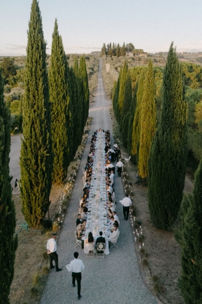 Nothing feels more cinematic than a dinner stretching down a cypress-lined drive, where perspective does most of the visual work.