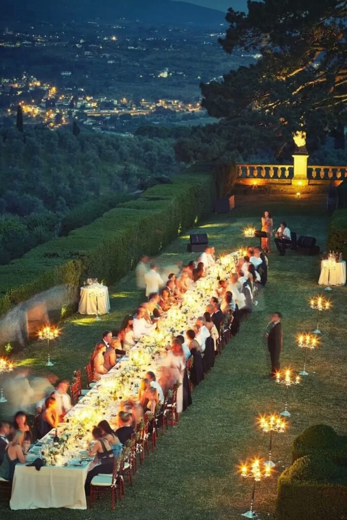 As night settles over hills and villages, the setting shifts naturally into something intimate, even with a long guest list.