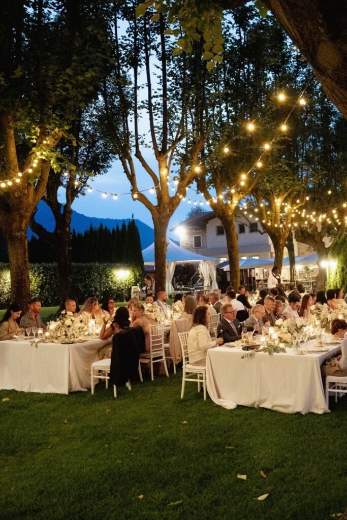 String lights woven through trees instantly soften a villa garden, creating warmth that feels relaxed yet unmistakably Italian for evening celebrations.