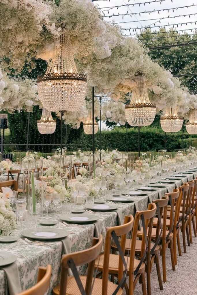 This wedding setup shifts attention upward, making even simple linens and chairs feel intentional, layered, and unmistakably high-end.