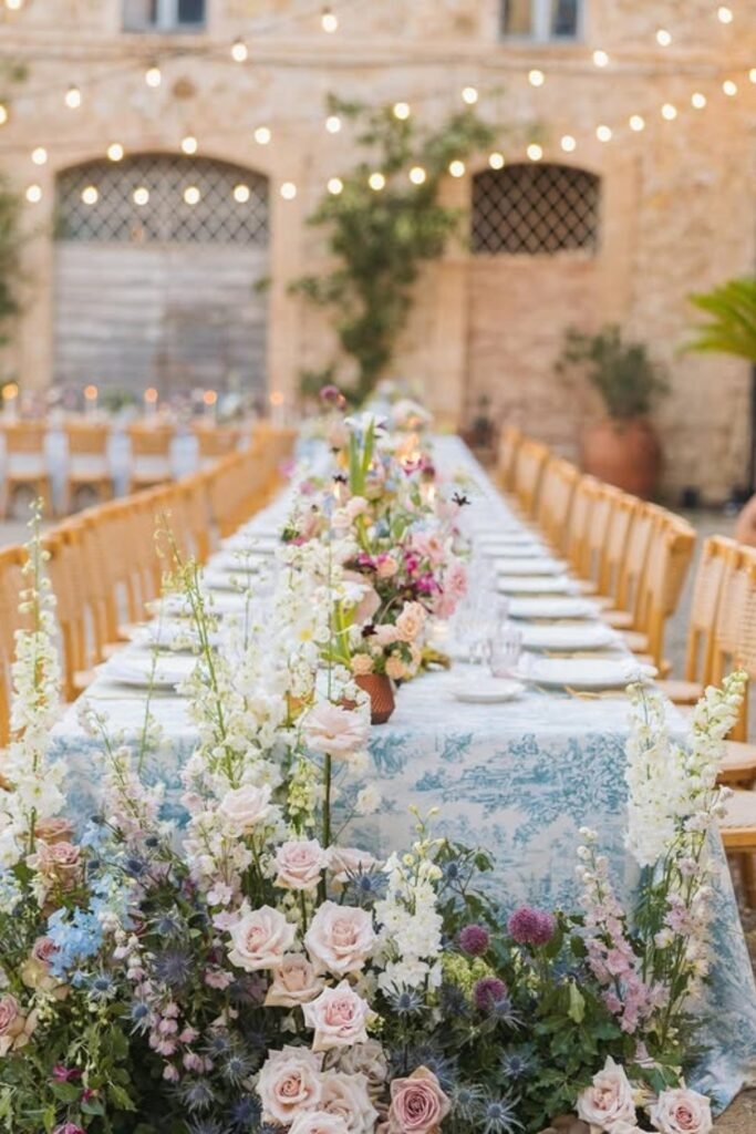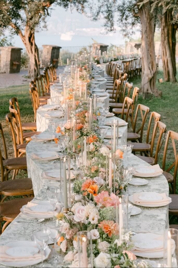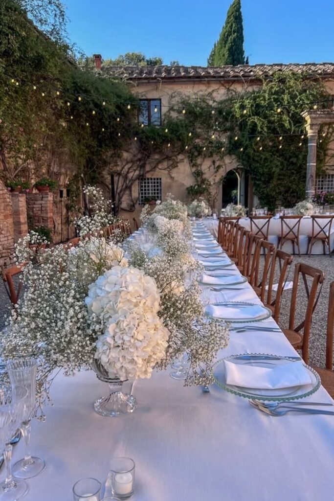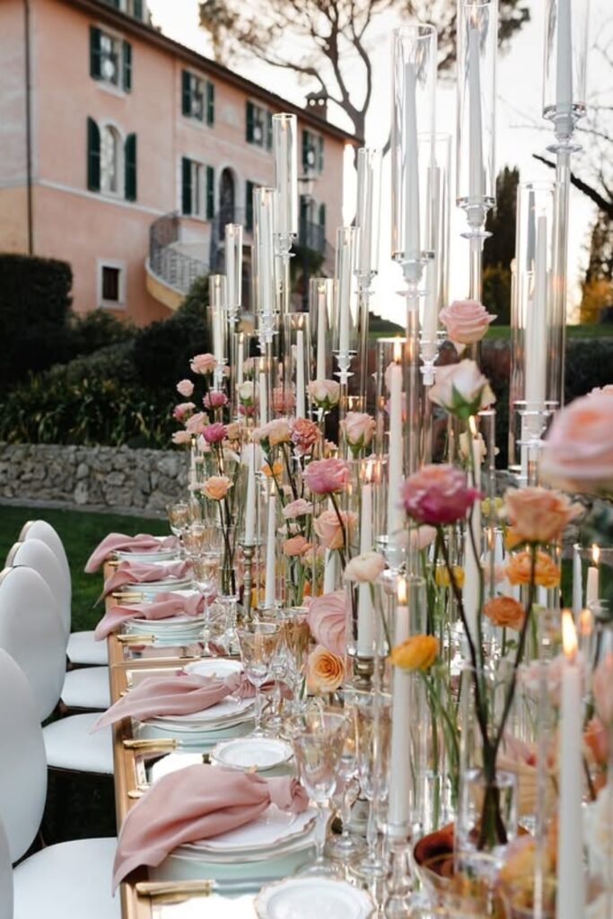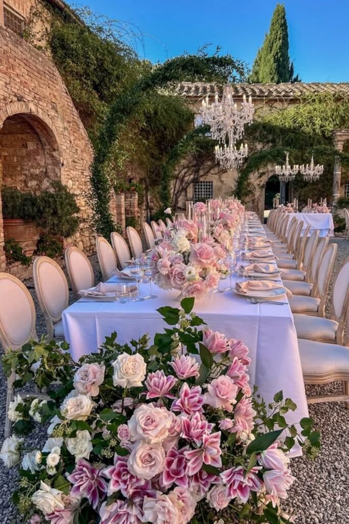 This Italian villa wedding approach balances symmetry with warmth, making long tables feel romantic without losing their refined, European character.