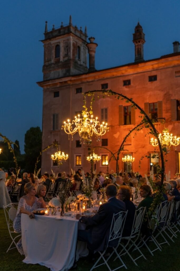 This Italian villa wedding setup benefits from clean linens and transparent chairs that don’t interrupt sightlines or compete with historic surroundings.