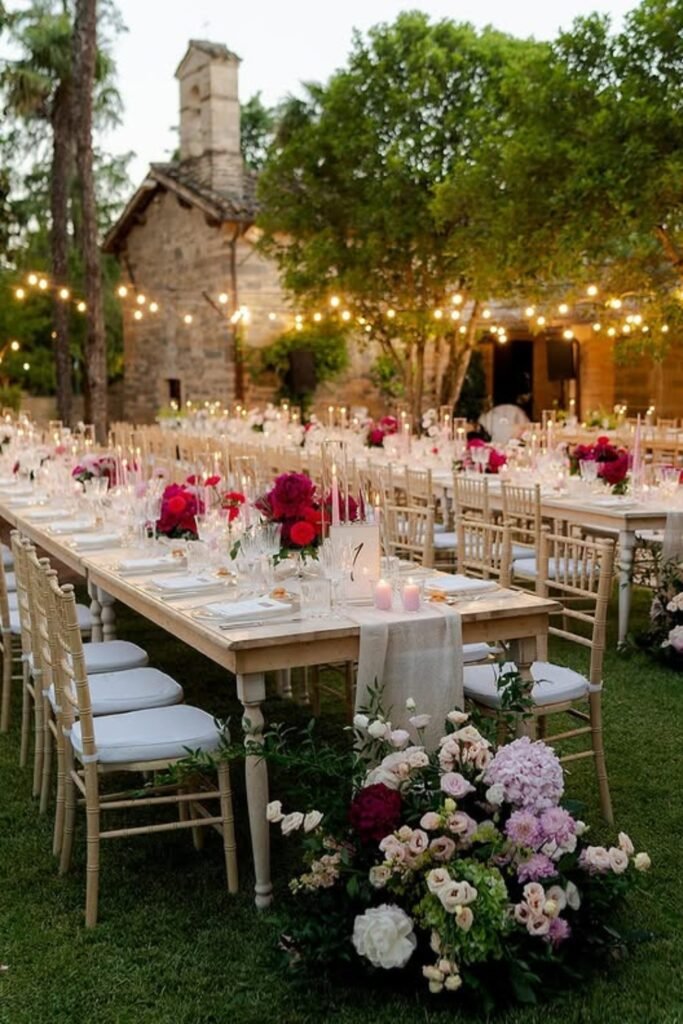 Stone courtyards shine when tables run long, letting soft florals and candle clusters guide the eye toward the villa façade naturally.