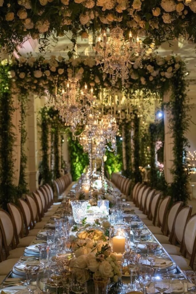This Italian villa wedding style lets crystal details lead visually, keeping tables minimal and allowing the space to feel layered, romantic, and intentional.
