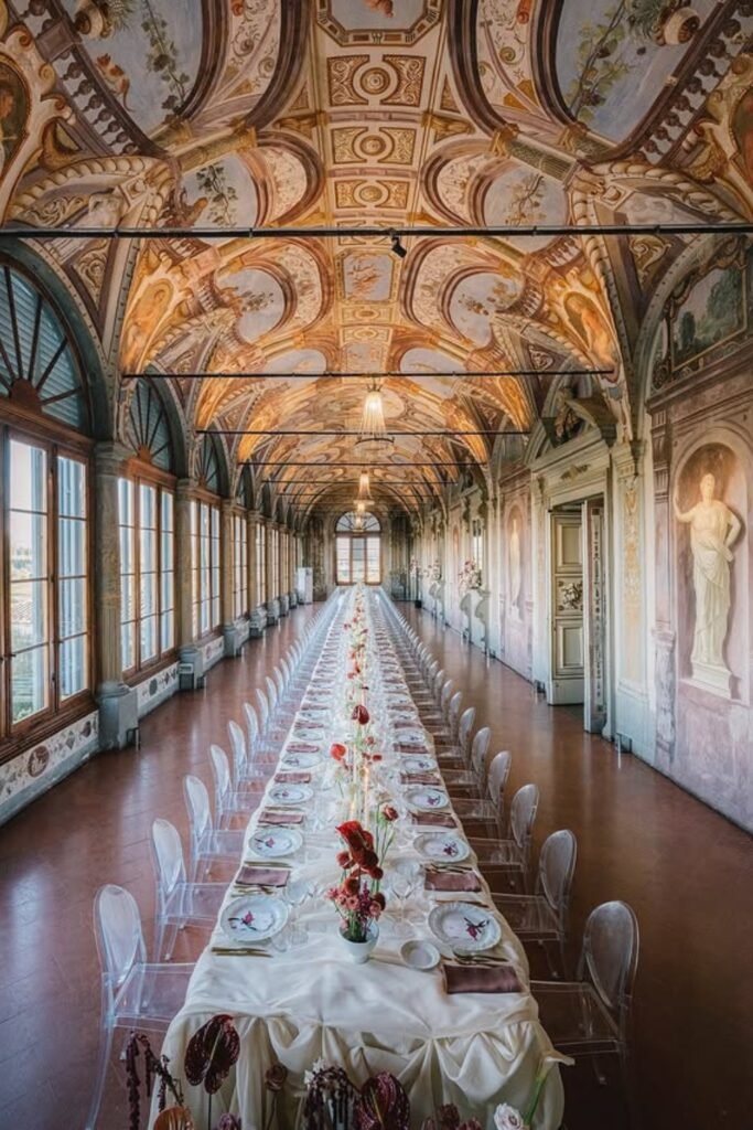 This frescoed villa hall turns dinner into theatre, where painted ceilings, symmetry, and long tables instantly create timeless Italian wedding drama.