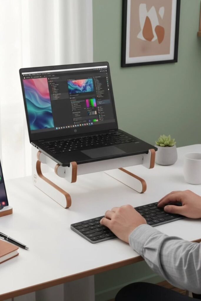 Beyond looks, the raised platform brings the screen closer to eye level, which keeps the neck from dipping forward all day.
