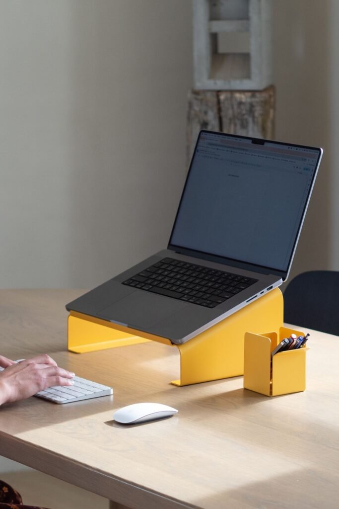 Bright color changes the whole mood of a workspace. Yellow metal under a silver laptop instantly makes the setup feel intentional instead of accidental.
