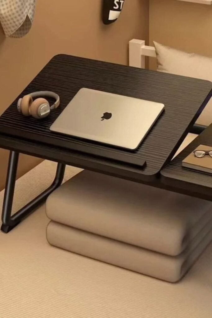 Late-night work on the bed usually ends with a sore neck and overheated laptop. A tilted lap desk like this changes that instantly.