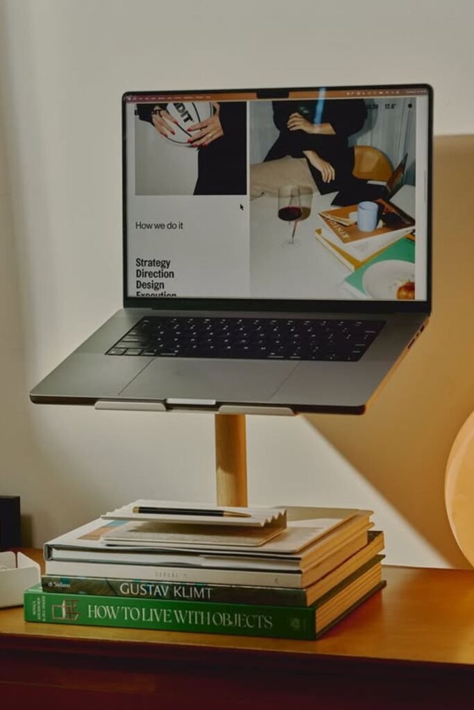 Almost feels like the laptop is hovering. Slim black stand lifts the screen high while keeping the base footprint small. Perfect for tight desks where every inch matters.