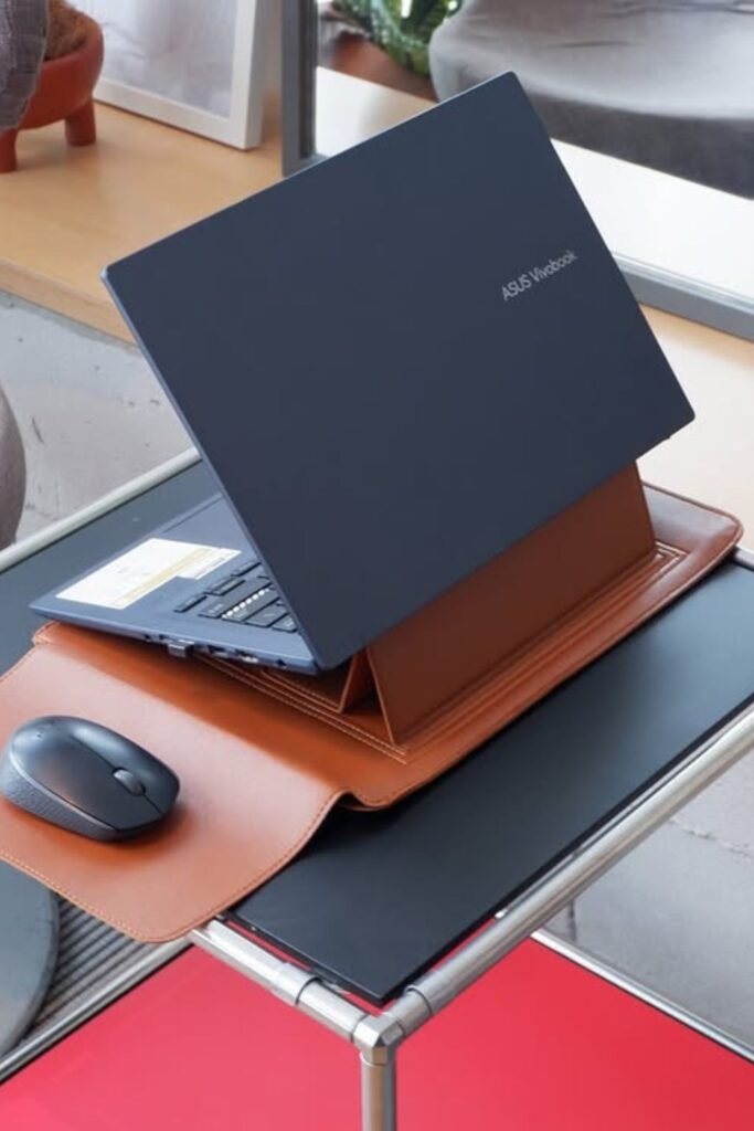 Travel days don’t have to mean bad posture. Foldable leather laptop stand like this slips inside your bag and unfolds into a simple angled support within seconds.