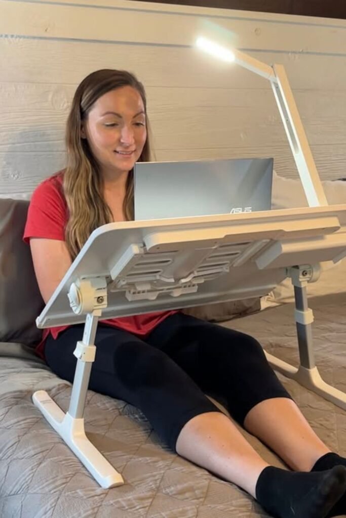 Works best for night-time productivity, recovery days, or small apartments without a full desk. Choose a sturdy frame with locking joints so it stays stable while typing.
