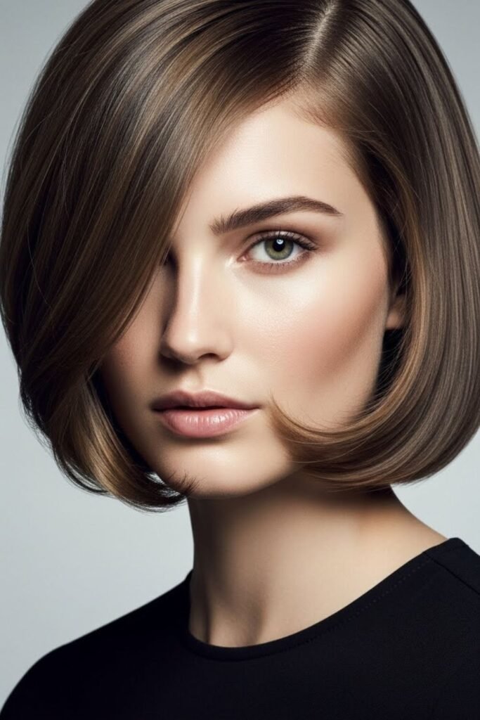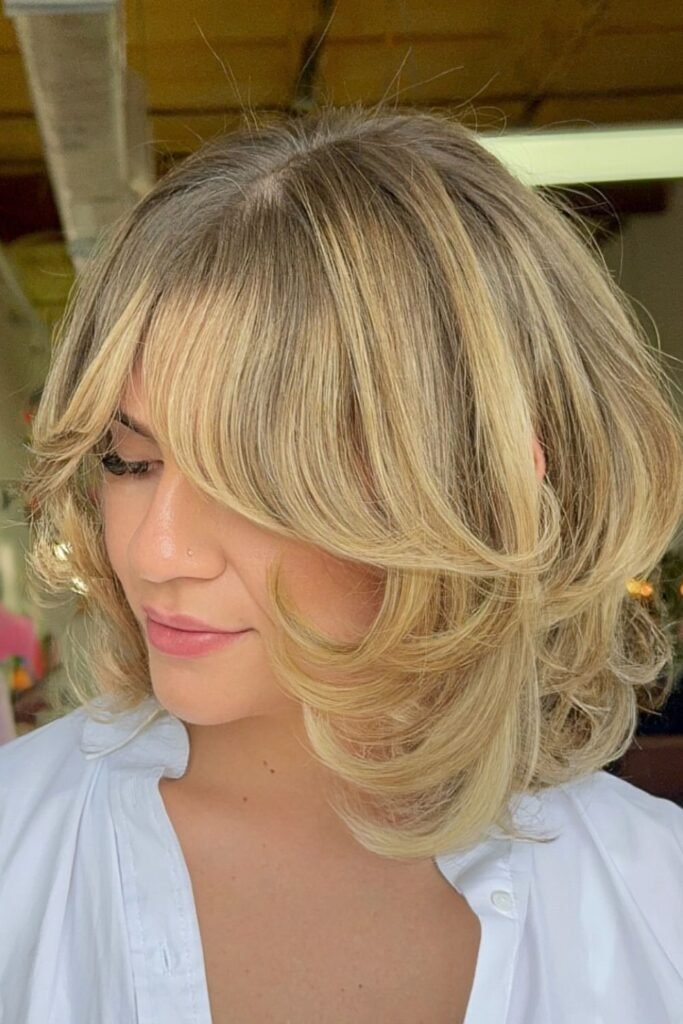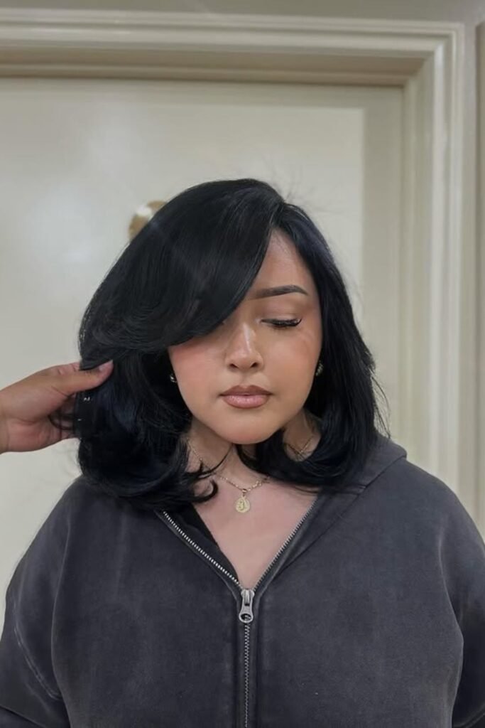 It’s a good choice for medium to thick hair, especially if it has a tendency to look flat at the front. To achieve this look, request a long side bang that seamlessly blends into the rest of the hair.