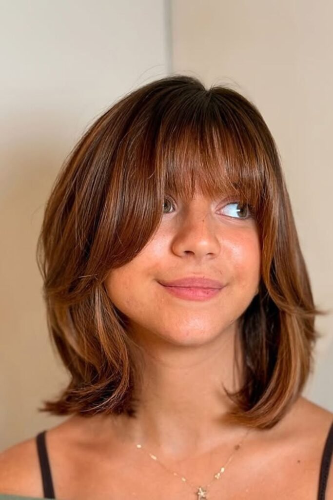 To get this, look for light, airy bangs that unite into the medium layers. Then, use a round round brush to style, focusing on the fringe.