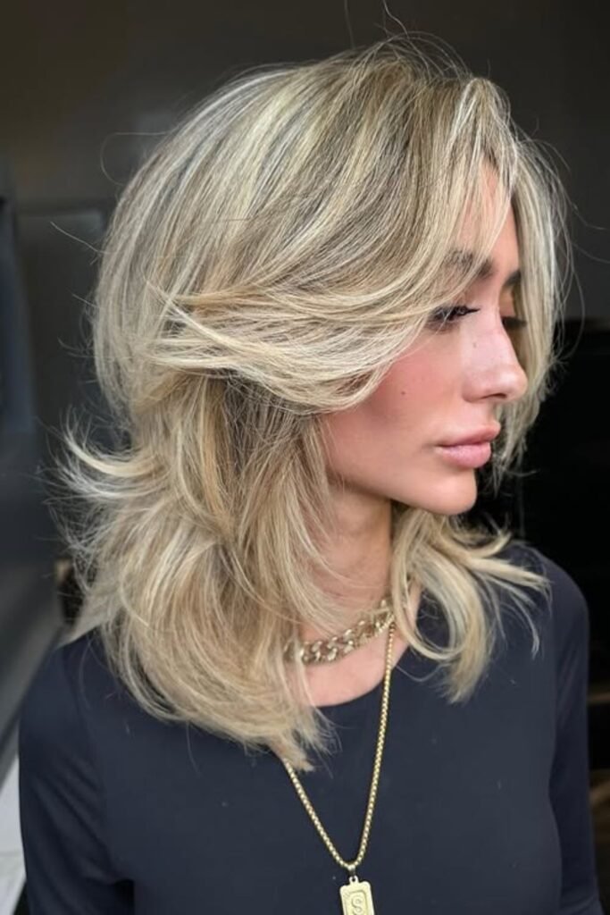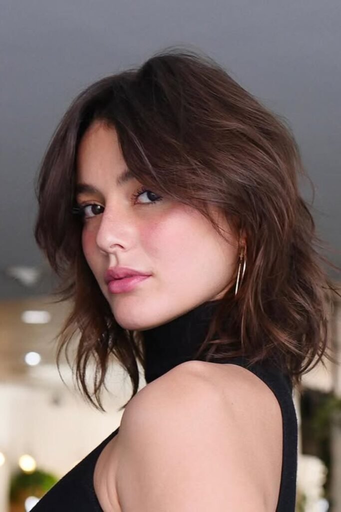 Texture stays understated until the hair is in motion. A veiled shag haircut relies on smoothness, keeping a neat look or uneven layers hidden beneath.