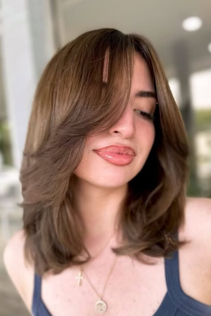 Weight vanishes from the front, yet the overall silhouette remains intact. This kind of feathered fringe is ideal if you’re after a softer look around the face.