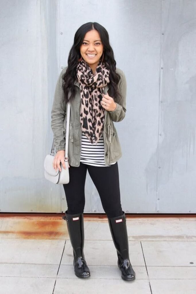 The olive jacket gives the outfit shape, and the leopard scarf adds individuality to the black leggings and striped tee.