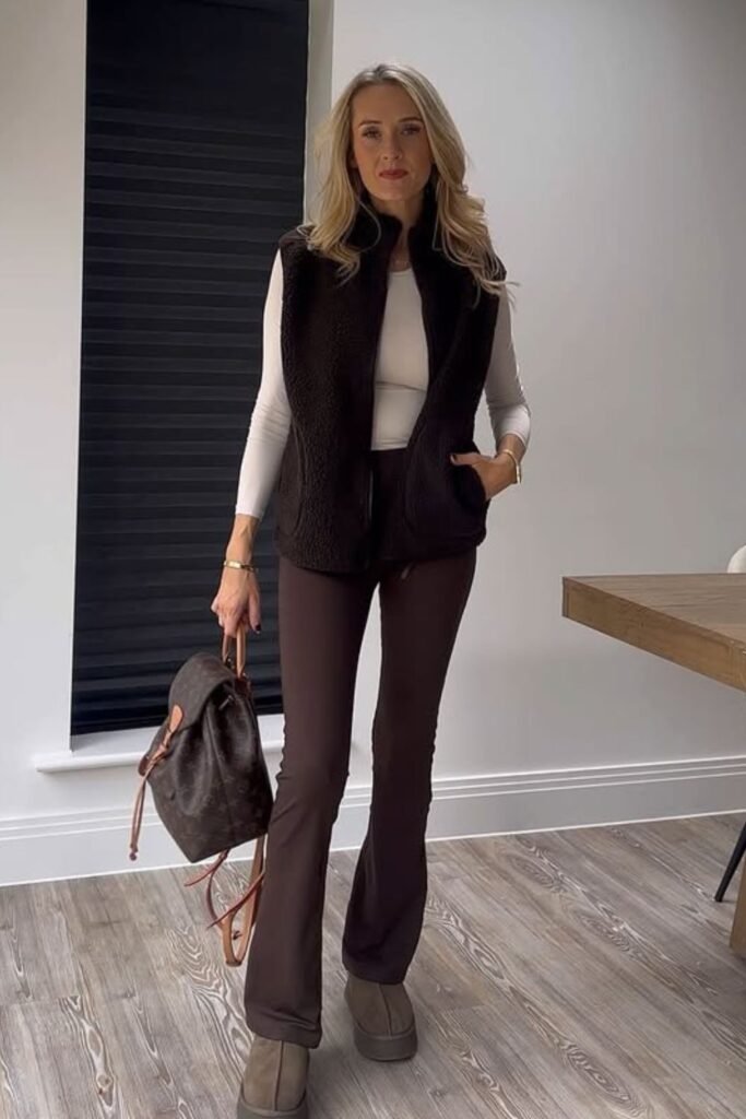 The brown flared pants and cream top maintain the base clean, and the black fleece vest provides comfort and shape.