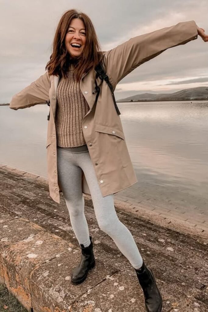 Instead of running shoes, try wearing leggings with a trench coat, knit sweater, or big blazer and finishing the look with boots or loafers.