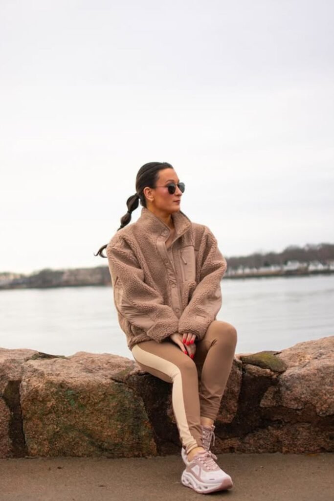 The brown leggings form a smooth basis, and the big teddy fleece jacket offers warmth and a soft texture that are great for cold morning walks or cozy days of travel.