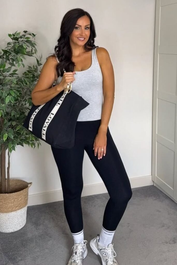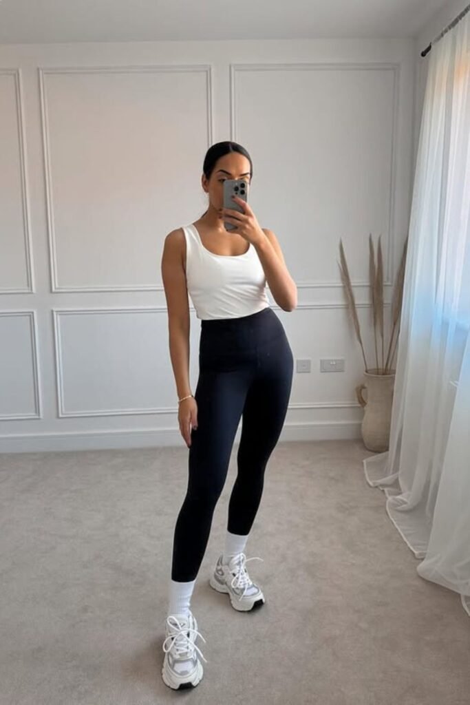 You don’t need layers when simple looks this amazing. The black leggings and white tank top make a clean, simple basis that always works.