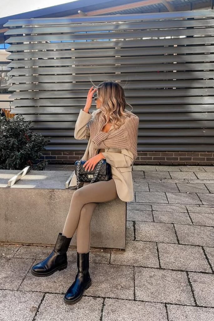 This outfit captures that soft, high winter style. The taupe leggings make a smooth base, while the big beige blazer adds style.