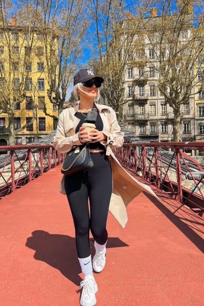 The traditional beige trench coat instantly makes the black leggings and white sneakers look more put together, giving you that “running errands but still stylish” look.