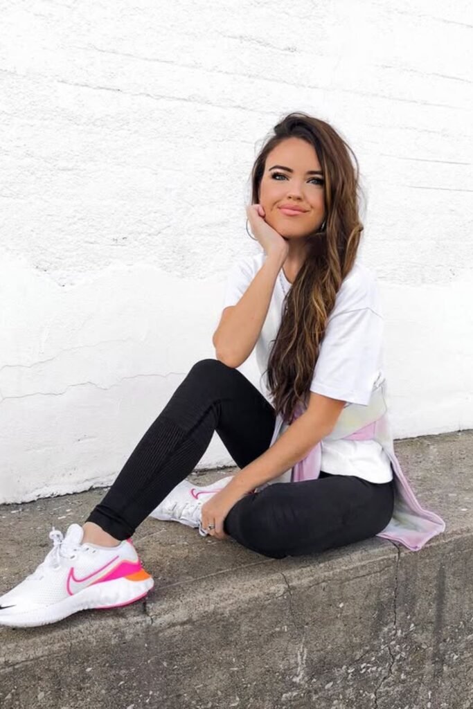 The black leggings and white tee provide a simple base, but the white shoes with pink embellishments make the outfit look joyful and young right away.
