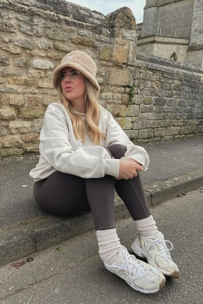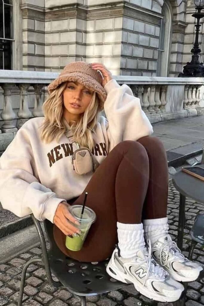 This attire makes me feel like I’m warm and confident. The brown leggings provide the outfit a base, and the cream graphic sweatshirt and textured bucket hat lend a chic, city-girl touch.