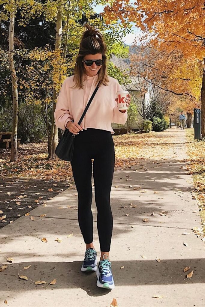 The black leggings make it sleek, while the light pink cropped sweatshirt lends warmth and softness to the fall colors.