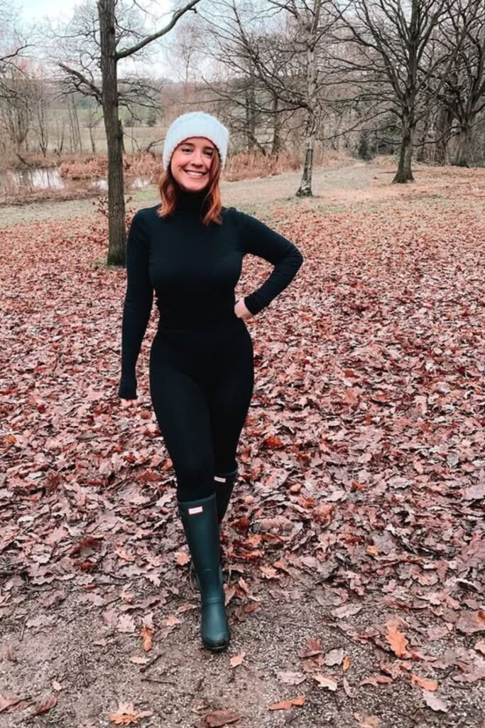 The tall rain boots make it all come together in a way that is both useful and stylish for weather that changes.