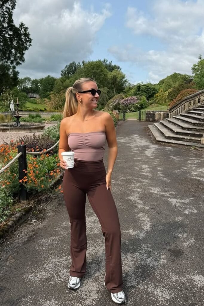 The mauve blouse without straps looks great with the chocolate brown flared leggings. The two colors seem fresh and feminine together.