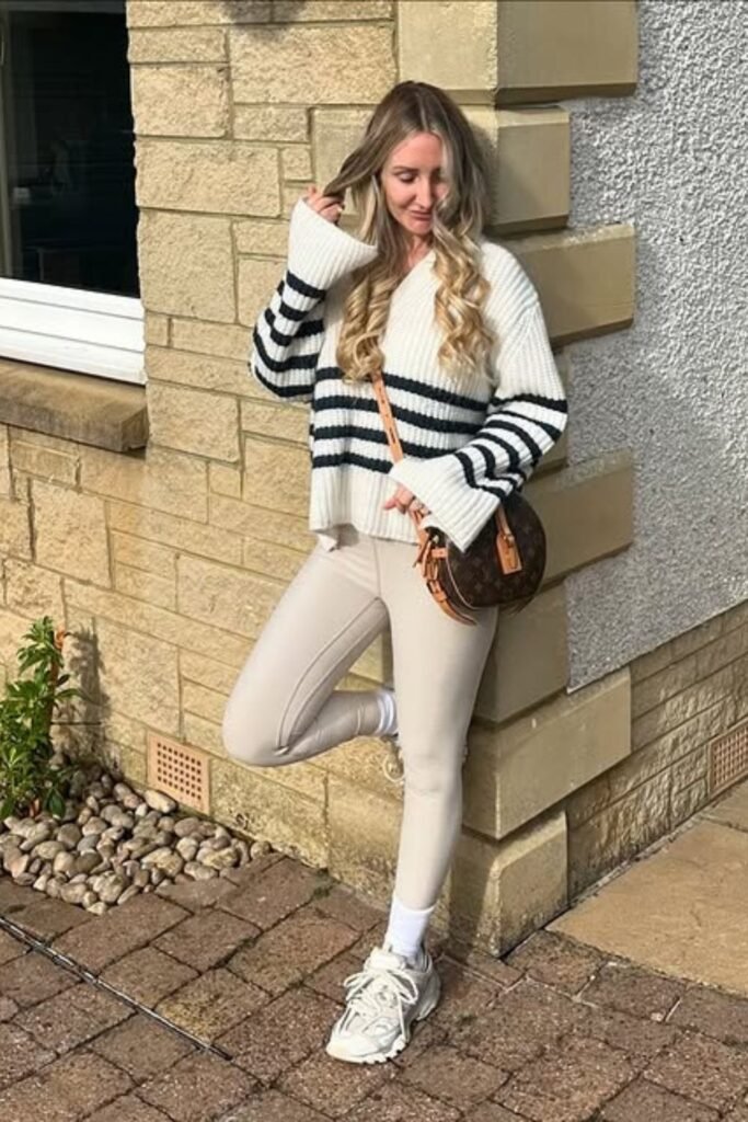 The cream leggings make the ensemble simple and neutral, and the striped oversized sweater provides shape and warmth.