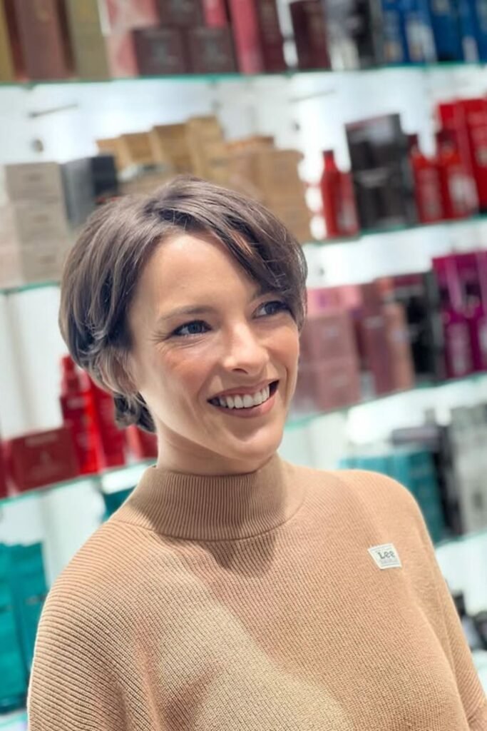 The top remains soft. The overall effect is a subtle softness that still preserves structure. Its a good alternative when a classic pixie cut seems too harsh.